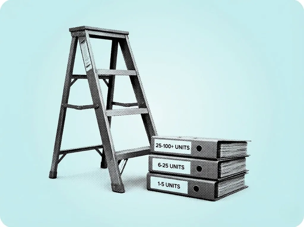 Portfolio Operator (25 to 100+ doors). You manage by dashboards, SOPs, and delegated execution. You consider portfolio and blanket structures, DSCR loans, and small-balance multifamily programs as your acquisition size grows and as you move into 5 or more units.