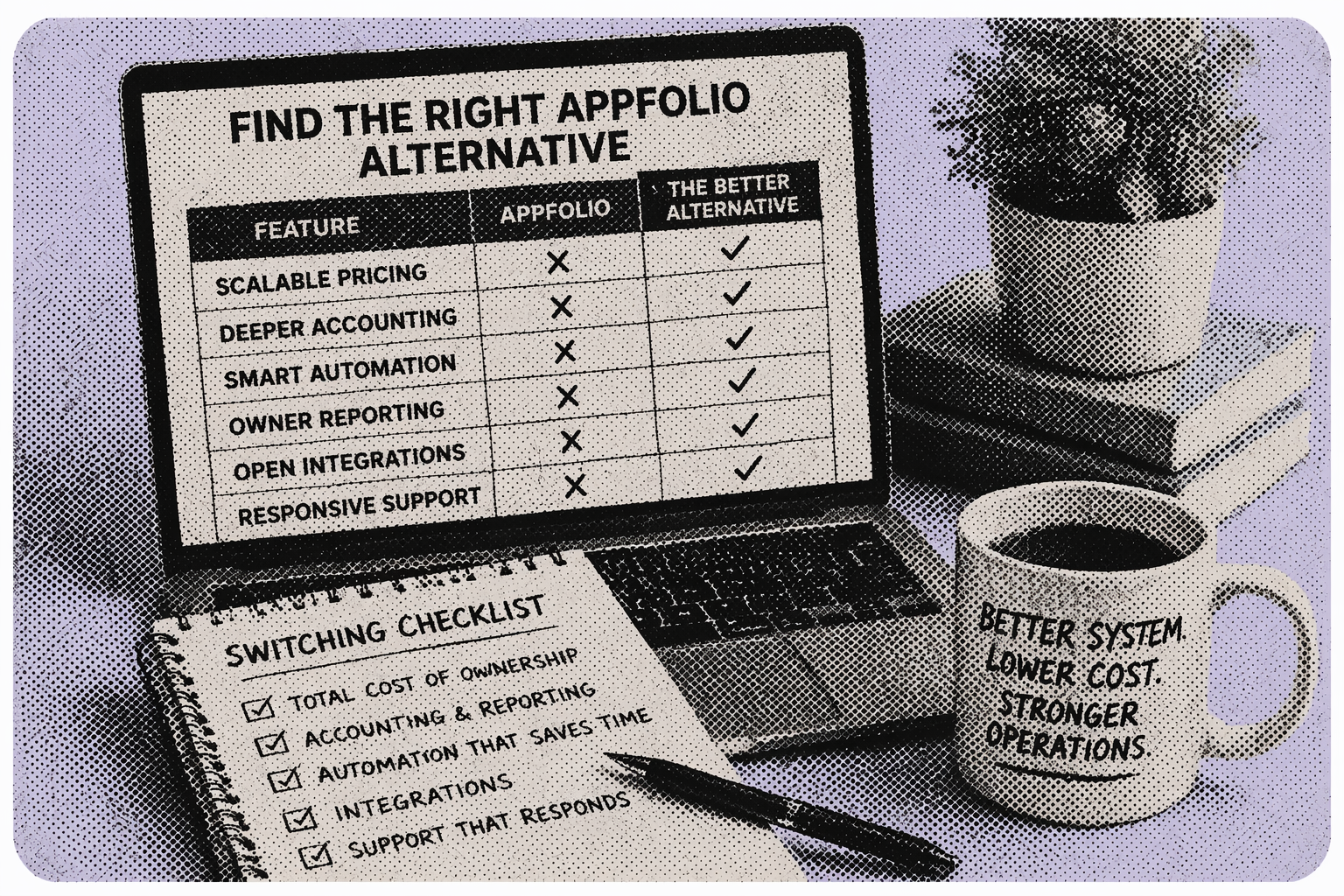For portfolios where AppFolio has started to show its limits, the evaluation criteria are specific. A strong alternative scales without punitive pricing cliffs as unit count grows, offers deeper accounting and auditability than a general-purpose bookkeeping layer, provides automation that measurably reduces manual work rather than just adding configuration options, delivers owner-grade reporting without requiring staff to build custom exports before every meeting, supports integrations through an open API or robust connectors, and backs all of it with responsive human support.